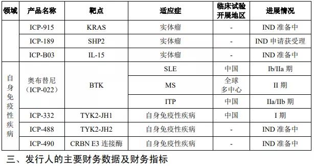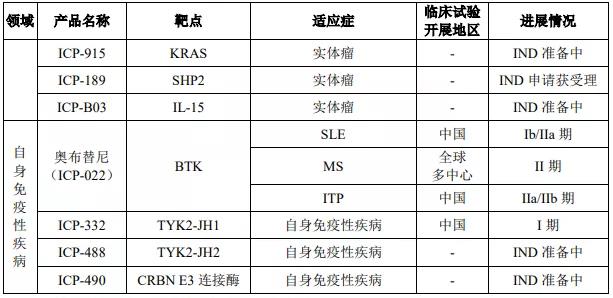 公司的产品布局聚焦于具有广阔市场空间的肿瘤与自身免疫性疾病领域,侧重于构 建具有协同效应的创新疗法。在血液瘤方面,公司拥有奥布替尼(BTK 抑制剂)、ICP-490(CRBN E3 连接酶调节剂)和 Tafasitamab(靶向 CD19 的单克隆抗体)等具备高度差 异化竞争优势及协同效应的血液瘤治疗产品,其中奥布替尼已获得国家药监局附条件批 准上市用于治疗复发或难治性 CLL/SLL 以及复发或难治性 MCL;在实体瘤方面,公司 拥有 ICP-192(泛 FGFR 抑制剂)、ICP-723(泛 TRK 抑制剂)、ICP-189(SHP2 抑制剂) 等产品,覆盖多种实体瘤治疗机制;在自身免疫性疾病方面,公司正在开发用于治疗由 B 细胞或 T 细胞功能异常所导致的自身免疫性疾病的多款产品,包括奥布替尼(BTK 抑制剂)、ICP-332(TYK2-JH1 抑制剂)和 ICP-490(CRBN E3 连接酶调节剂)等。除 单药疗法外,公司也积极挖掘在研产品与标准疗法或其他疗法联合用药的潜力。