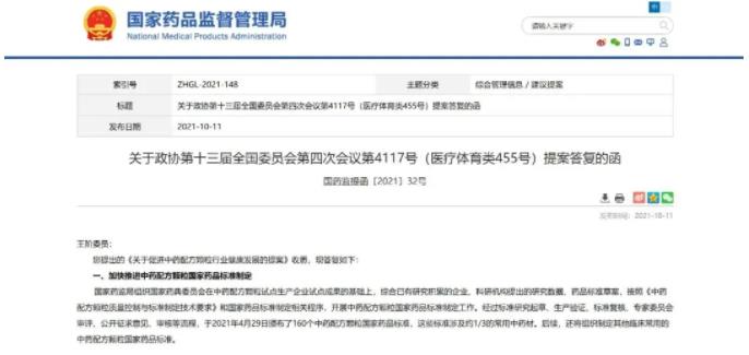 10月11日,国家药监局发布《关于政协第十三届全国委员会第四次会议第4117号(医疗体育类455号)提案答复的函》,根据《关于结束中药配方颗粒试点工作的公告》要求,中药饮片品种已纳入医保支付范围的,各省级医保部门可综合考虑临床需要、基金支付能力和价格等因素,经专家评审后将与中药饮片对应的中药配方颗粒纳入支付范围,并参照乙类管理。