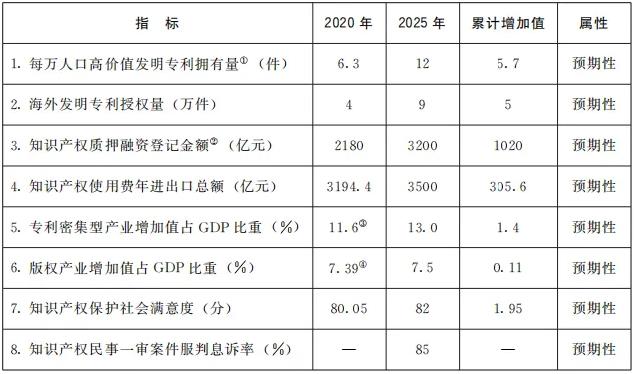 ——知识产权运用取得新成效。知识产权转移转化体制机制更加完善,知识产权归属制度更加健全,知识产权流转更加顺畅,知识产权转化效益显著提高,知识产权市场价值进一步凸显,专利密集型产业增加值和版权产业增加值占GDP比重稳步提升,推动产业转型升级和新兴产业创新发展。