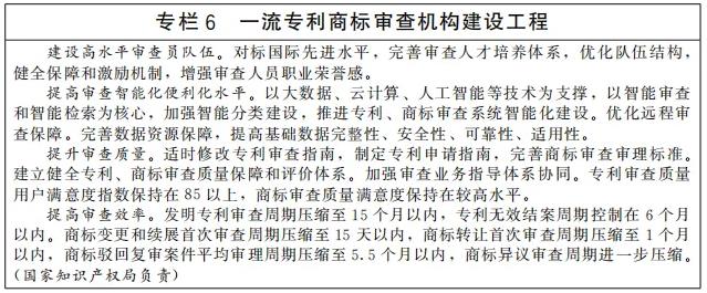 提高知识产权审查质量和审查效率。完善适应创新发展需求的知识产权审查管理体系,优化专利、商标审查协作机制。提升专利商标审查机构能力水平,强化专利、商标、版权、地理标志、植物新品种全流程审查质量管控,提升知识产权授权确权质量。提高专利、商标审查业务精细化管理水平,优化审查资源配置,加强智能化技术运用,提升审查效能,缩短审查周期。完善专利、商标审查模式,加强审查与产业发展的政策协同和业务联动,满足产业绿色转型和新领域新业态创新发展等社会多样化需求。(中央宣传部、工业和信息化部、农业农村部、国家林草局、国家知识产权局等按职责分工负责)