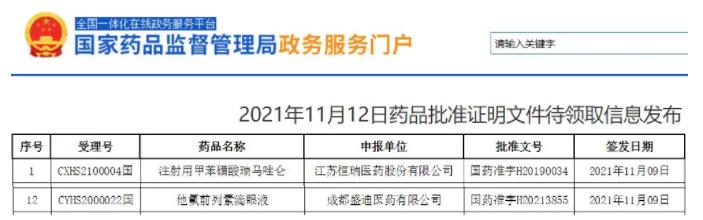 [1]2021年11月12日药品批准证明文件待领取信息发布 . Retrieved Nov 12,2021, from https://www.nmpa.gov.cn/zwfw/sdxx/sdxxyp/yppjfb/20211112084913129.html