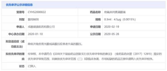 2020年1月,恒瑞医药的他氟前列素滴眼液在中国递交上市申请并获得受理,该申请随后还以“临床急需、市场短缺的药品”为由被CDE纳入优先审评,用于降低开角型青光眼或高眼压症患者升高的眼压。此次恒瑞医药的他氟前列素滴眼液获批,为该产品首仿。