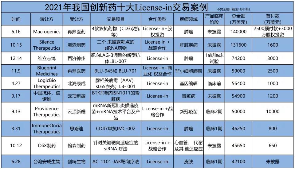 本文的License-in既包括国内药企从国外药企获得的授权,也包括国内药企之间的相互授权,在此列出不完全统计、截至12月18日的2021年我国创新药十大License-in交易案例,以供参考。