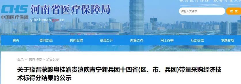 2021年12月25号,河南省医疗保障局发布《关于豫晋蒙赣粤桂渝贵滇陕青宁新兵团十四省(区、市、兵团)带量采购经济技术标得分结果的公示》的通知,通知指出根据《豫晋蒙赣粤桂渝贵滇陕青宁新兵团十四省(区、市、兵团)药品联合带量采购文件》(编号:YPLH-YD2021-1)等有关要求,现将豫晋蒙赣粤桂渝贵滇陕青宁新兵团十四省(区、市、兵团)带量采购经济技术标得分进行公示,公示时间为2021年12月25日至2021年12月27日。