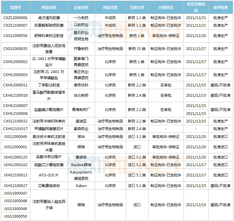 (12.11-12.24)新药上市申请审评审批状态更新