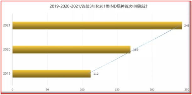 IND申请,是我国化学创新药研发能力的重要标志物之一,品种的首次申报数量,体现着国内药企在过去一年内的总体研发进展。通过统计,2021年全年,国内化学药1类品种首次申请IND数量>243个,在2019年的基础上,实现了新增品种数量上的翻倍。