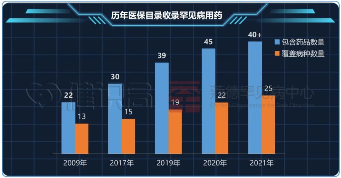 2021年12月,已有40余种被纳入了国家医保目录,涉及25种疾病。