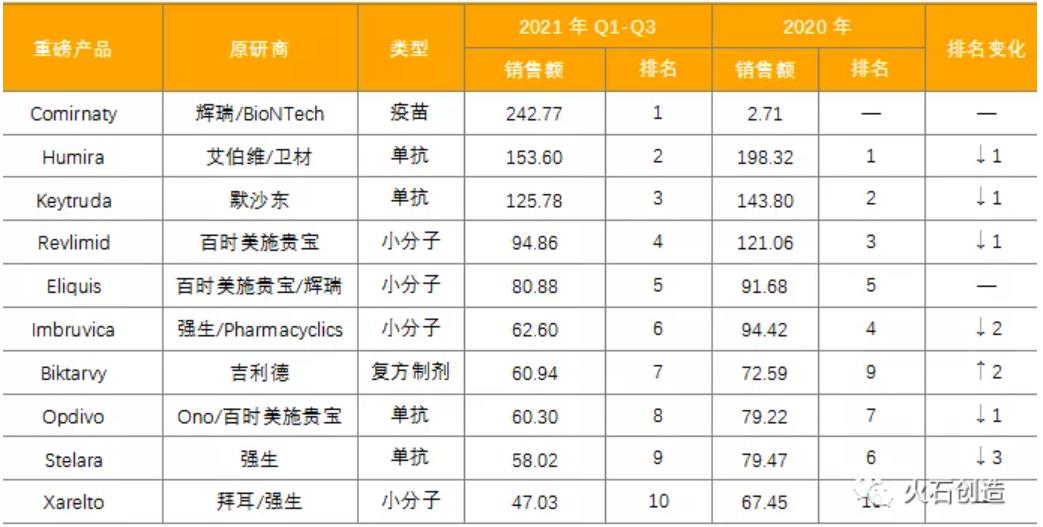 随着全球跨国药企2021年Q3财报的公布,2021年前三季度全球畅销药物TOP10榜单已经出炉。