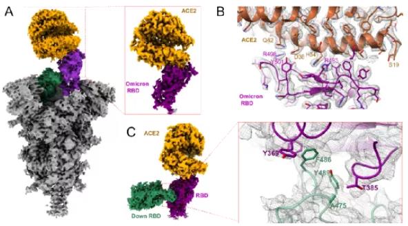 图1 Omicron突变株新冠病毒刺突蛋白结合受体ACE2的结构。A展示结构整理构象,B为RBD结合ACE2的相互作用界面,C为RBD二聚体的相互作用界面。
