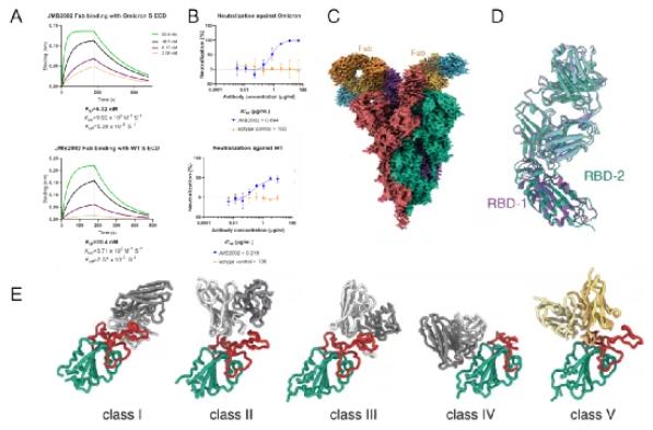 图2 Omicron突变株新冠病毒刺突蛋白结合抗体JMB2002的结构。A展示JMB2002抗体片段分别与Omicron突变株和野生型新冠病毒刺突蛋白的结合,B展示JMB2002抗体分别对Omicron突变株和野生型的抑制,C为Omicron突变株新冠病毒刺突蛋白结合抗体JMB2002的结构,D为结合JMB2002抗体片段RBD的结构比较,E为抗新冠病毒中和抗体的分类,JMB2002抗体为新型抗体,被归为第五类。