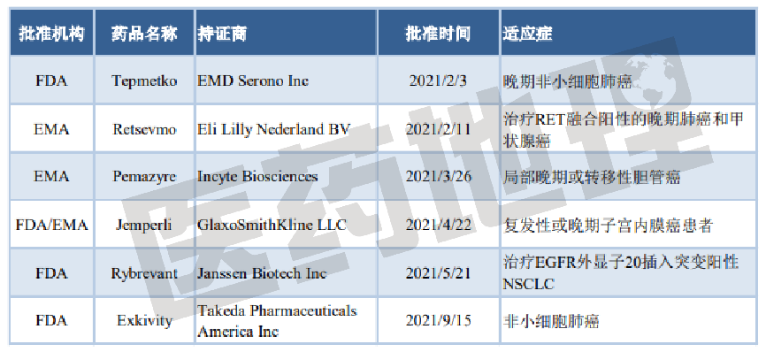 靶向抗肿瘤药Tepmetko,用于治疗携带MET基因第14号外显子跳过改变(METex14skipping)的晚期非小细胞肺癌(NSCLC)成人患者,是全球第一个被批准用于治疗携带MET基因改变的晚期NSCLC患者的口服MET抑制剂。礼来公司的Retsevmo,用于治疗RET融合阳性的晚期肺癌和甲状腺癌。Pemazyre是治疗在接受至少一种系统疗法后病情复发或难治、存在FGFR2融合或重排、不能手术切除的局部晚期或转移性胆管癌患者的首个靶向疗法。葛兰素史克(GSK)抗肿瘤新药抗PD-1疗法Jemperli用于治疗接受含铂化疗期间或之后病情进展、错配修复缺陷(dMMR)复发性或晚期子宫内膜癌患者,同时获FDA和EMA批准。强生(JNJ)的EGFR-MET双特异性抗体Rybrevant,用于治疗在接受含铂化疗失败后病情进展、EGFR基因外显子20插入突变阳性的转移性非小细胞肺癌(mNSCLC)成人患者,是第一个获批治疗EGFR外显子20插入突变阳性NSCLC的靶向疗法。武田制药(Takeda)的肺癌创新药Exkivity,用于治疗先前接受含铂化疗期间或之后病情进展、经FDA批准的检测方法证实为携带表皮生长因子受体(EGFR)20号外显子插入突变(EGFRex20ins)的局部晚期或转移性非小细胞肺癌成人患者。