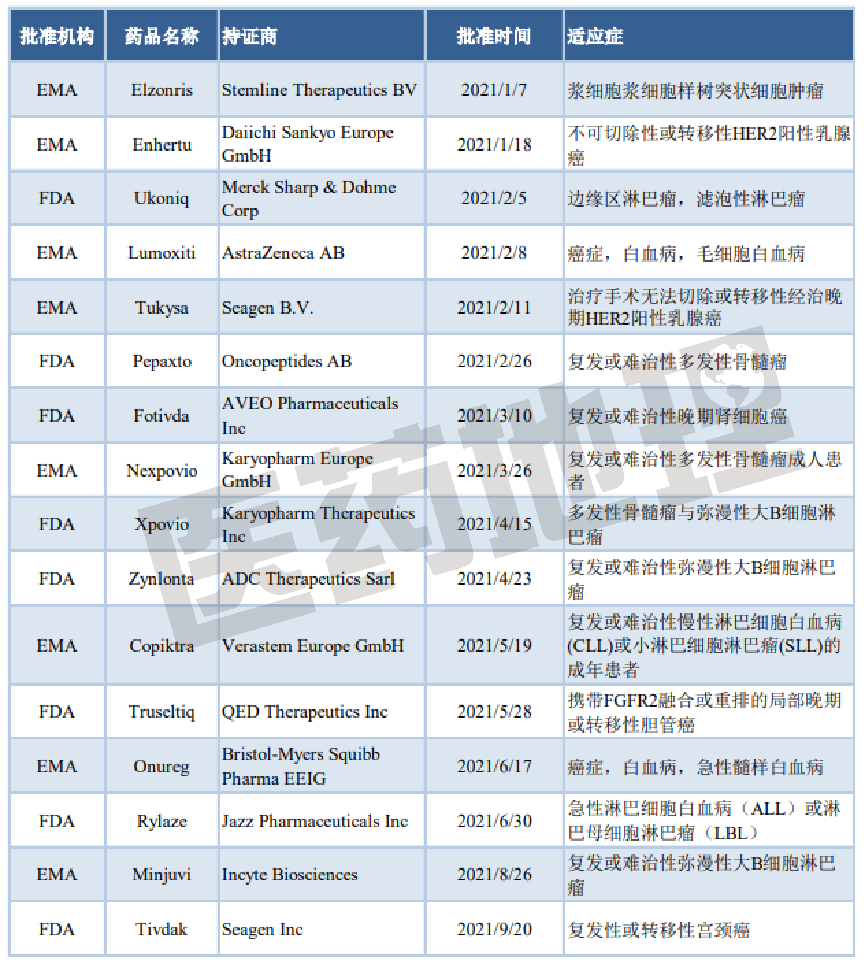 随着生物技术在医学领域的快速发展,以及对肿瘤发病机制研究的不断深入,肿瘤的诊断与治疗已向精准医学转化。2021年前3季度欧美批准了多款精准治疗的抗肿瘤新药。