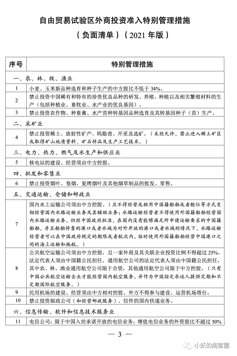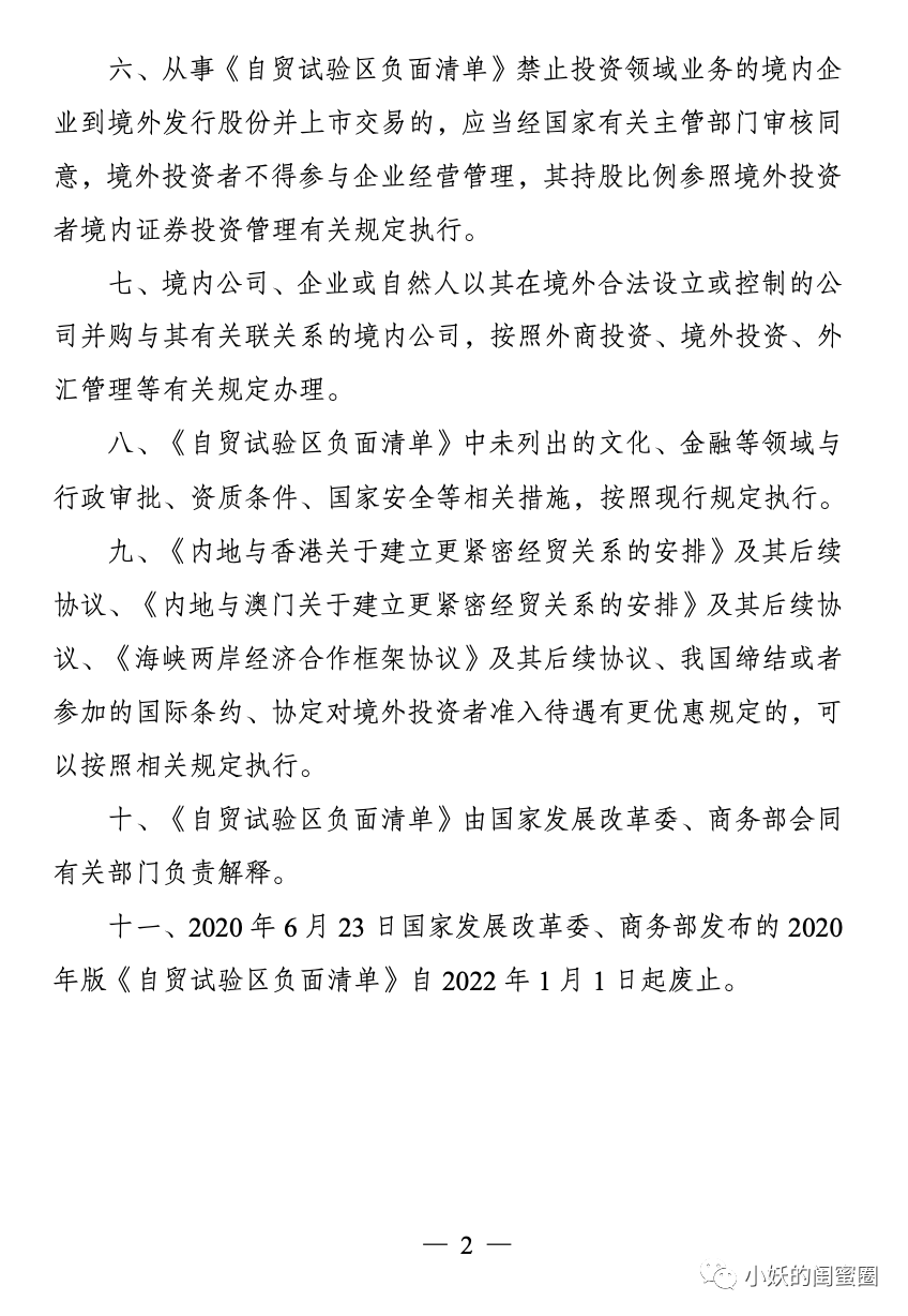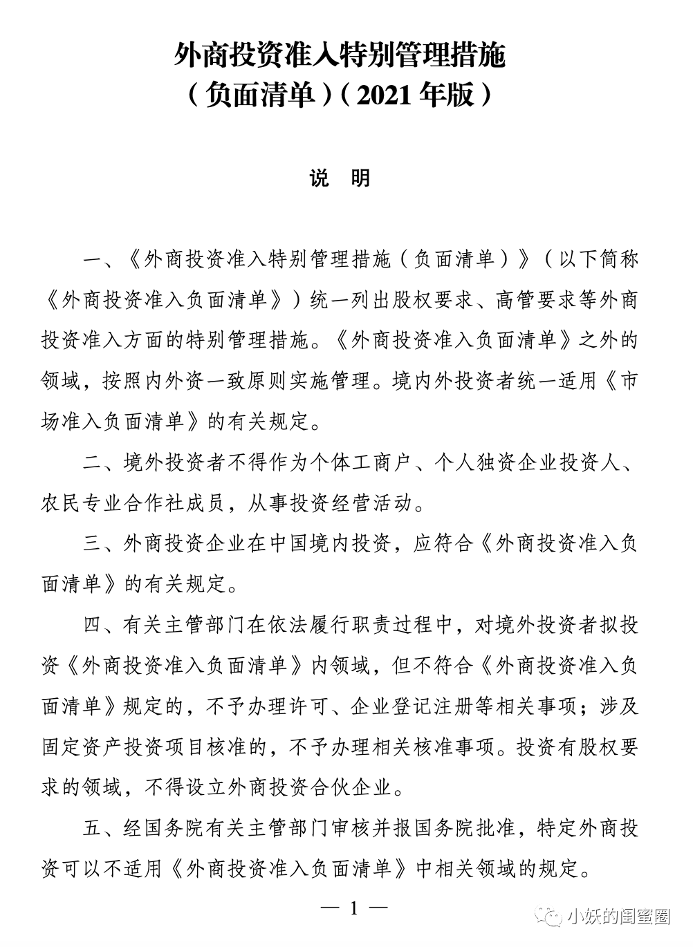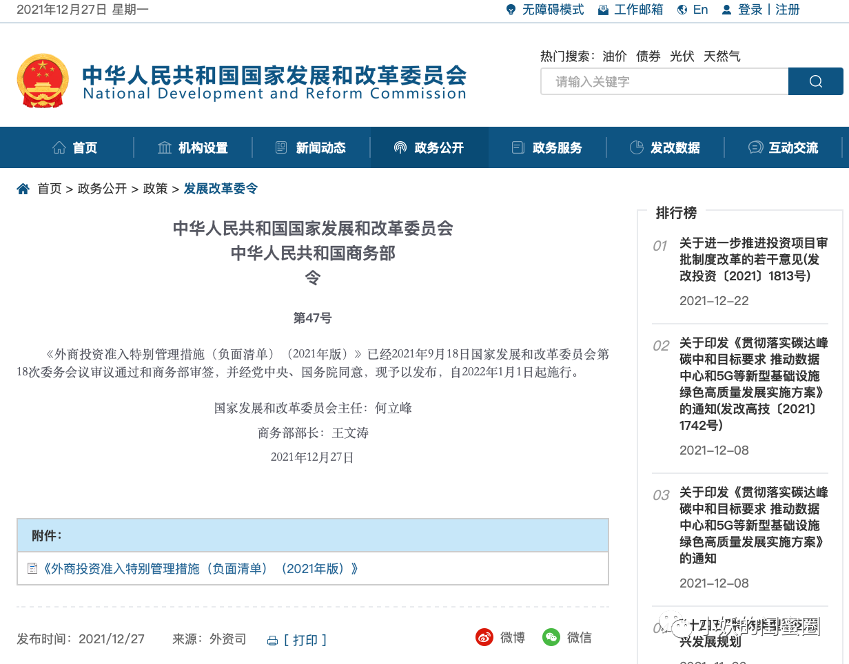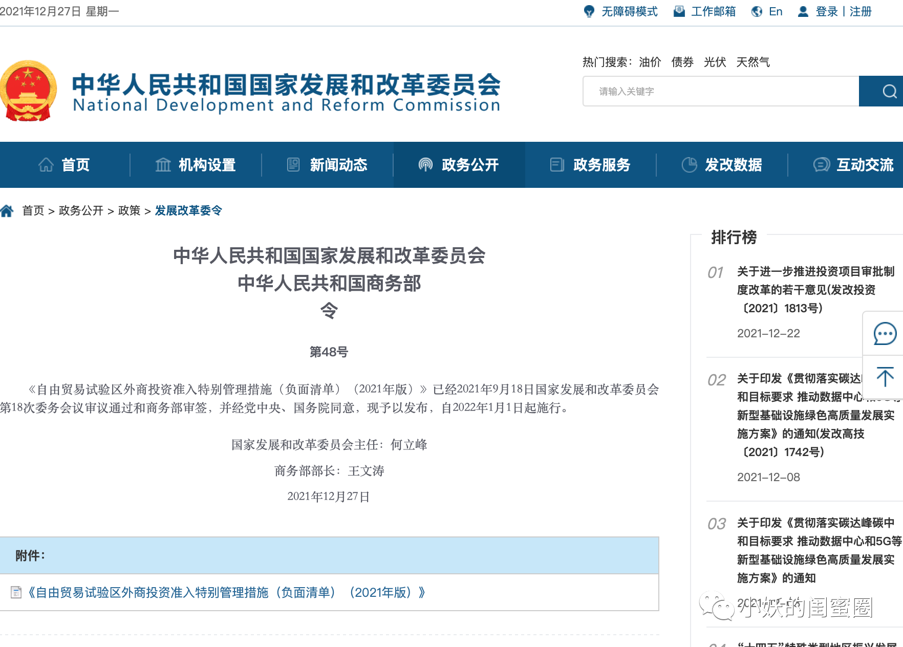 2021年12月27日,国家发展和改革委员会和商务部共同发布了第47号、第48号令,该令经党中央、国务院同意,由国家发展和改革委员会主任何立峰、商务部部长王文涛署名发布:“《外商投资准入特别管理措施(负面清单)(2021年版)》、《自由贸易试验区外商投资准入特别管理措施(负面清单)(2021年版)》自2022年1月1日起施行。