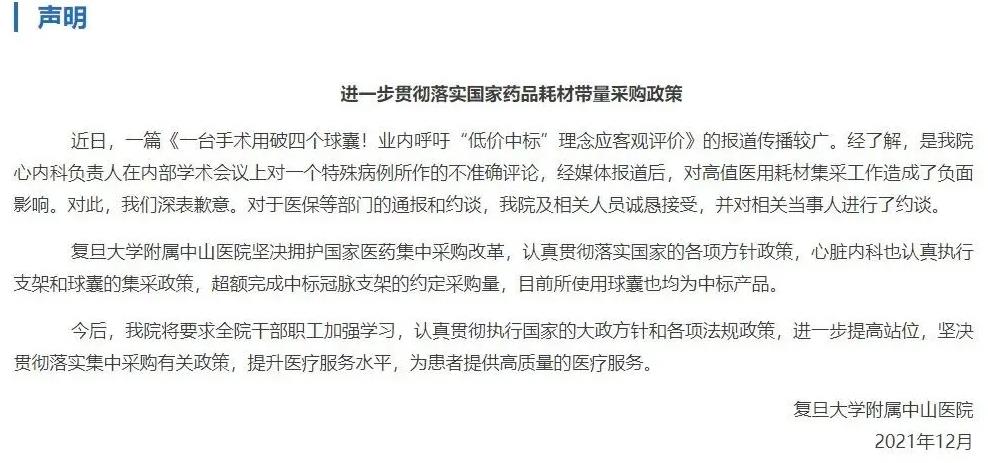该院表示,认可有关部门和专家组的调查结论,针对个别医务人员对外发表不准确评论等问题,将加强内部管理,规范临床诊疗行为,提高医疗质量。该院将认真落实党中央、国务院关于集中带量采购改革的部署要求,维护医疗器械监管秩序,加强医务人员思想政治工作,主动消除不良影响。