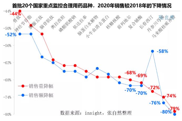 此前首批纳入的20个品种销售都遭遇了大幅下滑,下图展示了部分重点监控品种2020年销售额与2018年的比较,无论是销售额还是销售量都全部被腰斩,其中马来酸桂哌齐特的销售额和销售量都下降了八成。