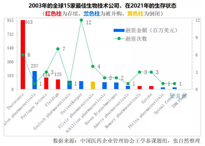 通过问卷调查,多数观点认为,Biotech成功转型Biopharma的仅占10%。同时通过对Fierce pharma于2003年评选出的15家最佳生物技术公司进行跟踪研究发现,到2021年,这15家公司中,有9家被并购、1家倒闭,只有5家存续。