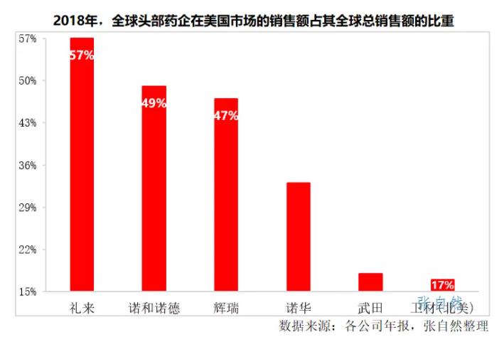 以2018年为例,礼来、诺和诺德、辉瑞在美国市场的销售额就分别占到了其公司总销售额的57%、49%和47%,即使一向保守的日本药企在美国的销售也占了其公司总销售额的近1/5.如武田占了18%、卫材(北美)占了17%。