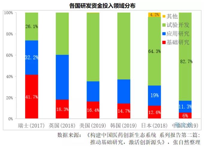近年来,我国的医药创新发展迅速,但仍以跟随式高仿为主,原创的东西较少,主要是我国基础研究氛围和投入都不足,如2019年我国用于基础研究的资金仅占研发总投入的6%,而瑞士(2017)、英国(2018)、美国(2019)、韩国(2019)和日本(2018)则分别占到了41.7%、18.3%、16.4%、14.7%和12.6%,目前的研发内卷也是体现,证券市场也已敲响了警钟,加强源头创新才能提高竞争力。