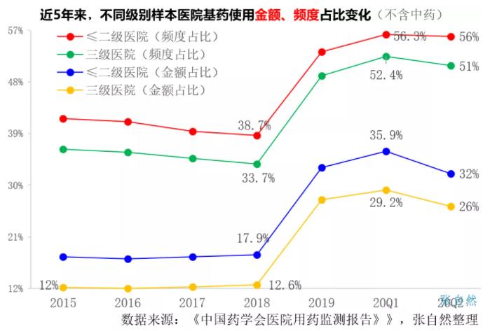 自2009年我国实施基本药物制度以来,基本药物经历了先快速发展又逐渐回落的过程,由于近年不断出台鼓励政策,基本药物又恢复发展,在临床的使用频度和金额方面都明显上升,如二、三级医院的使用频度占比分别由2018年的38.7%、33.7%提升到了2020年第二季度的56%和51%,使用金额占比分别由2018年的17.9%、12.6%提升到了2020年第二季度的32%和26%。