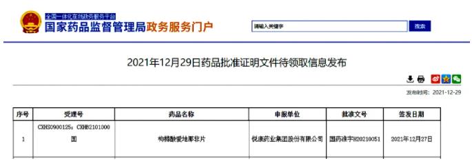 2021年12月27日,悦康药业集团股份有限公司的1.1类新药爱力士®枸橼酸爱地那非片正式获批(国药准字H20210051),该产品是国内首款拥有自主知识产权的PDE-5抑制剂,临床疗效显著。公司表示,产品上市后将多渠道同步发力,该新药有望成为抗ED领域的耀眼新星。近年来,悦康药业集团在创新升级中不断加码,爱力士®枸橼酸爱地那非片的获批,是公司创新药研发进程中的重要里程碑。