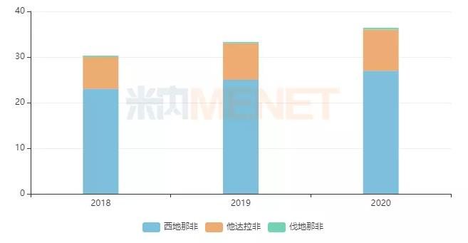 市场上畅销的抗ED品种包括了西地那非、他达拉非以及伐地那非,目前主要是国产品牌与原研药之间的竞争。米内网数据显示,最近三年在中国公立医疗机构终端及中国城市实体药店终端,西地那非、他达拉非以及伐地那非三大品种合计销售规模逐年上涨,2021年有望冲击40亿元,该品类的市场潜力正在持续爆发中。