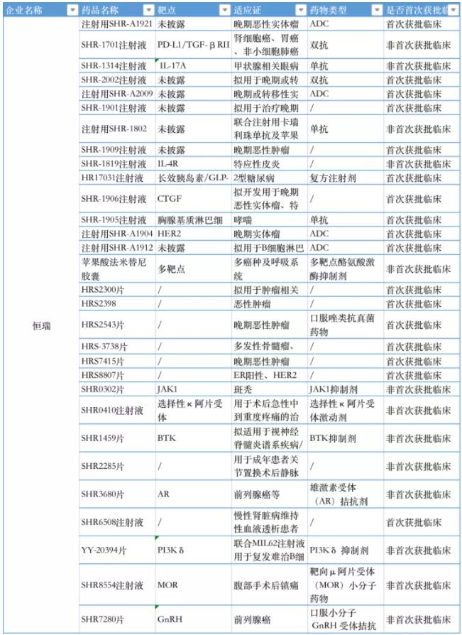 在抗肿瘤方面,IL-17A靶点的SHR-1314注射液、HER2靶点注射用SHR-A1904、CTGF靶点SHR-1906注射液以及多款未披露靶点的生物药和小分子药物共计16款药物获批临床,其中SHR-2002注射液为无同类药物处于临床开发阶段的靶点。
