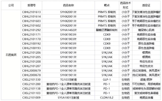 按照受理号石药共在CDE斩获了15个1类化药IND,5个1类生物药IND,共涉及7个品种。其适应证重点聚焦在肿瘤免疫领域,靶点覆盖了现今最为流行的PRMT5、CDK9、SYK/JAK、GLP-1、PD-1、CLDN18.2等重磅靶点。