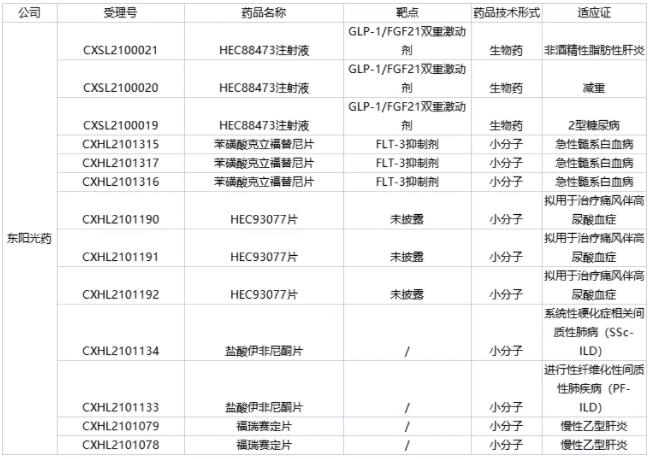 按照受理号东阳光药共在CDE斩获了10个1类化药IND,3个1类生物药IND,其适应证主要覆盖了血液瘤、代谢、抗病毒领域,靶点覆盖了GLP-1/FGF21、FLT-3.