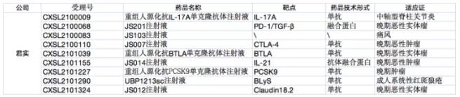 按照受理号梳理,君实共在CDE斩获了9个1类生物药IND,其适应证覆盖肿瘤、免疫和代谢领域,覆盖了PD-1/TGF-β、Claudin18.2、CTLA-4、BTLA、IL-21、IL-17A、PCSK9、BLyS等不同靶点。