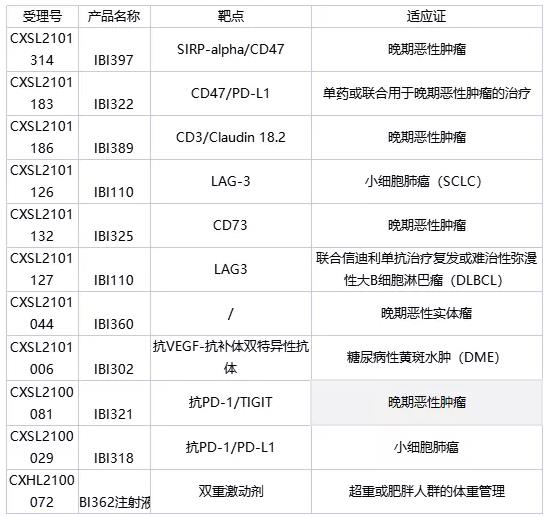 2021年,信达生物有11个品种的1类新药获批临床(不含已上市新药申报新适应症),其中有三分之二为双抗,适应证主要覆盖在肿瘤领域,靶点涉及3个PD-1双抗、2个CD47双抗以及LAG3、CD73等热门靶点的单抗。其中SIRP-alpha/CD47、抗VEGF-抗补体双特异性抗体布局领先。
