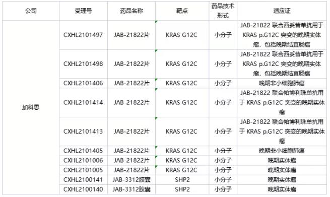 按照受理号加科思共在CDE斩获了10个1类化药IND,并未涉及生物药。其适应证全部覆盖于实体瘤领域,靶点主要是KRAS G12C、SHP2.