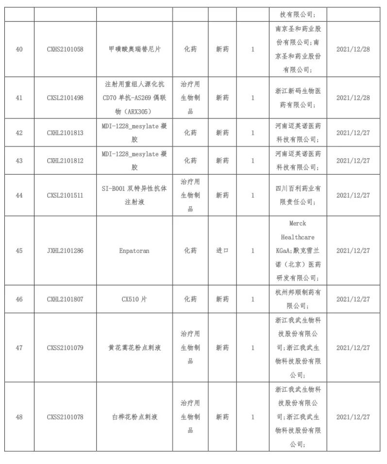 1类新药受理号共48个,其中化药26个,治疗用生物制品20个,中药2个。分别为: