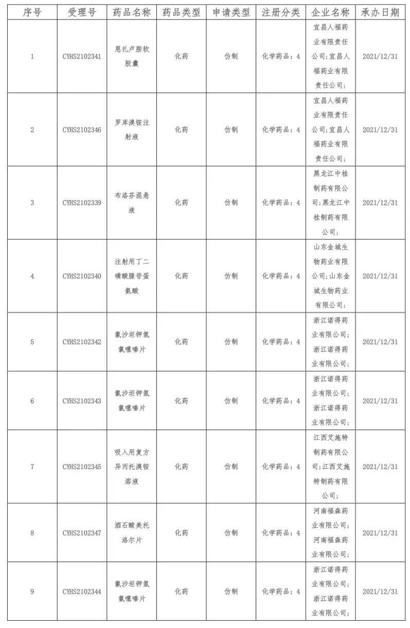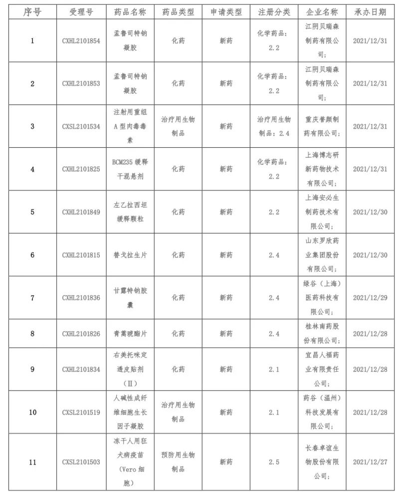 这些受理号分别来自10家企业,10种药品。其中,江阴贝瑞森制药有限公司的孟鲁司特钠凝胶的2个申请被受理。