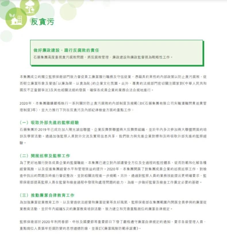 石药集团高度重视贪污腐败问题,将反腐败管理、廉政建设和廉政监督视为战略性工作。在《2020年社会责任报告》中披露了一系列关于防止贪污腐败的内部制度与规范(如:《石药集团有限公司失职渎职问责追责管理制度》等),并围绕吸取外部先进的监察经验、开展巡察及监察工作、推动廉洁自律教育工作、加强供货商管理以及完善招标采购工作的监督职能、完善举报机制五方面描述企业在反贪污及内部纪律检查方面的重点工作。