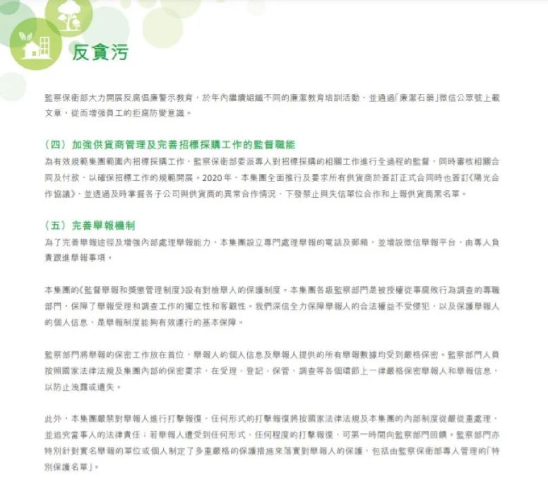 加强反贪污与商业贿赂的制度建设。完善反贪污与商业贿赂的管理体系,并披露详细清晰的管理目标与方针。此外,也需要披露反贪污与商业贿赂方面的举报机制、检举人保护制度、处理方式等相关程序。