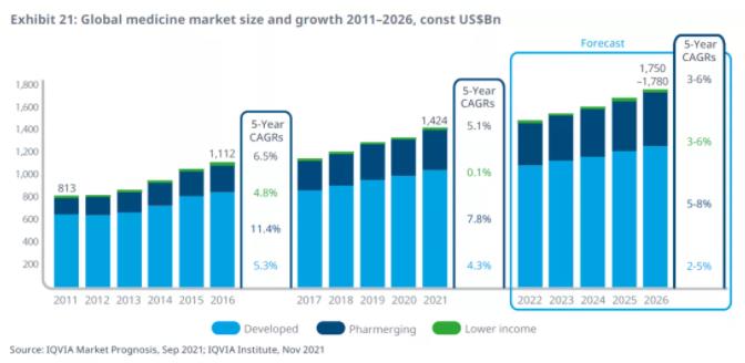 2021年,基于发票价格的全球药品支出大约为1.4万亿美元。2022-2026年期间,全球药品市场将以 3%-6%的复合年增长率增长,到2026年全球药品支出预计将达到近1.8万亿美元(包括新冠肺炎疫苗支出)。其中,新兴市场未来5年药品支出CAGR为5%-8%,略高于发达市场的2%-5%。