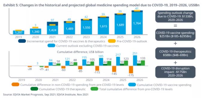 从第一款新冠肺炎疫苗上市到2026年,全球在新冠肺炎疫苗上的总支出预计将达到2510亿美元;新冠治疗药物的支出将达到580亿美元,换言之,COVID-19相关疫苗和疗法的总支出将达到3090亿美元。截至2026年,受新冠肺炎疫情冲击,非 COVID-19相关支出将减少1750亿美元。也就是说,截至2026年,COVID-19将使全球药品总支出净增1330亿美元。