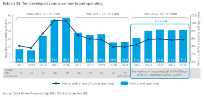 到2026年,主要发达市场新产品带来的支出增长将达到1960亿美元,而过去5年这一数字为1610亿美元,增幅超过20%。IQVIA预计,2022-2026年,将有290-315个新活性物质获批上市,平均每年54-63个,与过去五年基本持平。