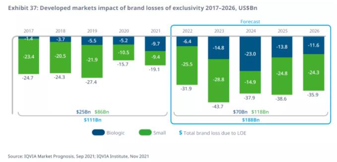 未来5年,随着发达国家市场诸多重磅品种专利到期,市场独占权丧失(LOE)的影响将达到1880亿美元,相比过去5年的1110亿美元,专利到期的影响进一步扩大。在此期间,生物类似物将累计节省药品支出2150亿美元。