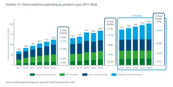 中国药品市场的增长仍是新兴医药市场增长的最大贡献者。中国药品支出增长的贡献主力是原研品牌药,2022-2026年CAGR为10.4%,其他类型产品的CAGR则不超过3%。