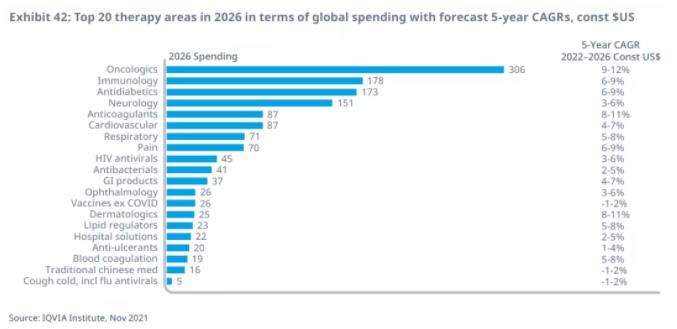 在免疫领域,2026年药品支出将达到1780亿美元,相较2021年的1270亿美元增加了510亿美元,复合年增长率为6%-9%。在发达市场,仿制药和生物类似物造成的价格压力以及产品专利到期,部分抵消了药品用量增加和新产品上市带来的支出增长。