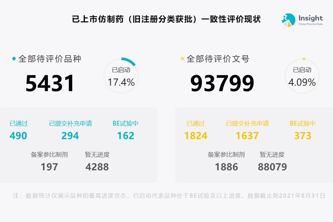 Insight 一致性评价数据库统计,全部待评价品种目前启动率为 17.4 %,490 个品种有相关企业通过一致性评价。