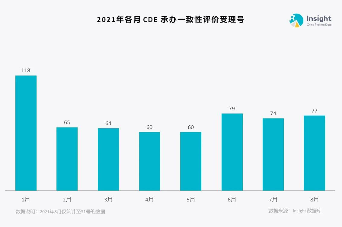 截止 2021 年 8 月 31 号, 8 月份 CDE 承办了 77 个新申报的一致性评价受理号。