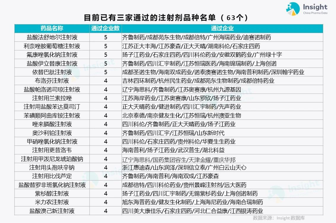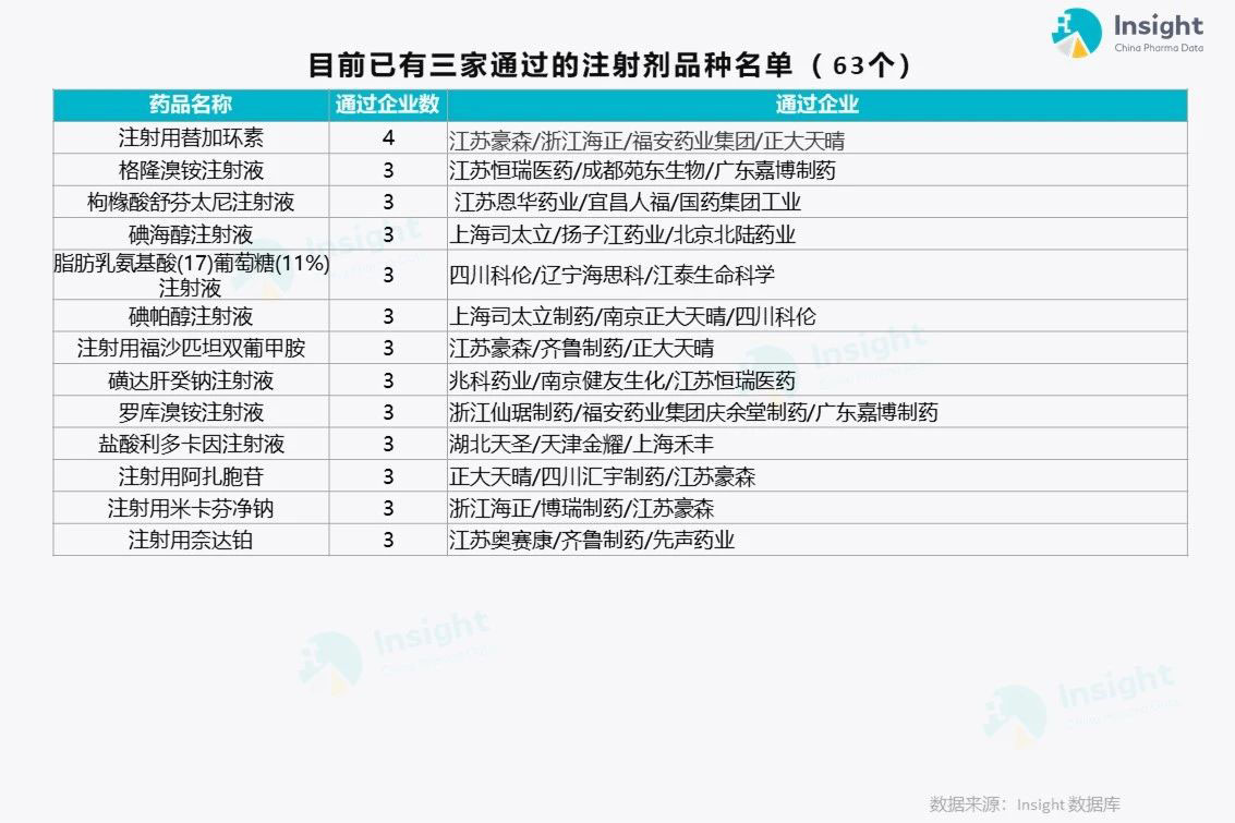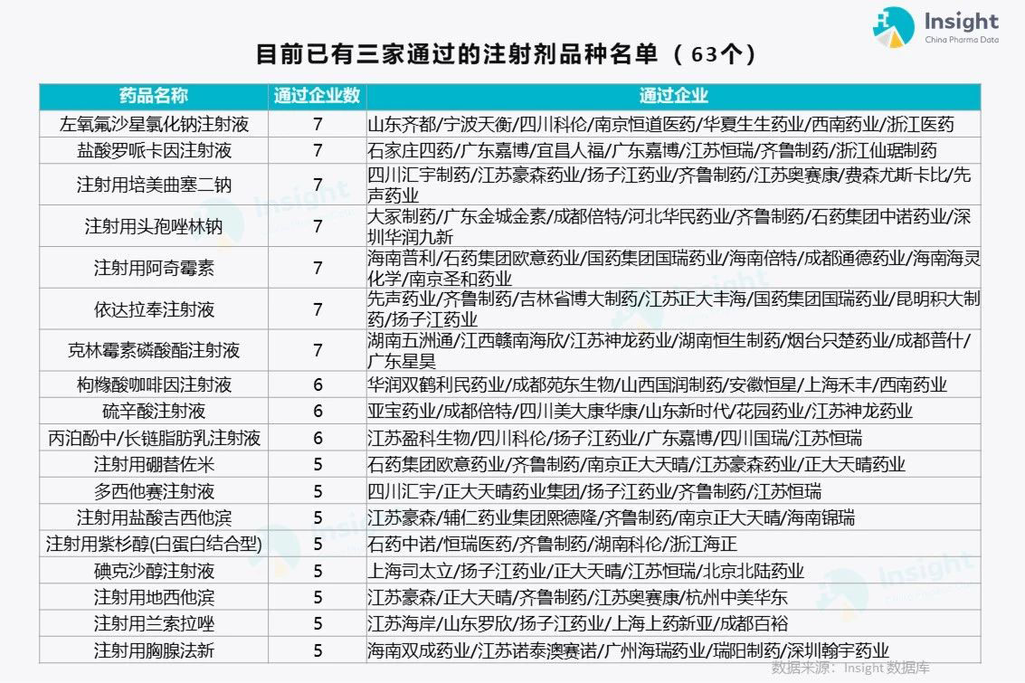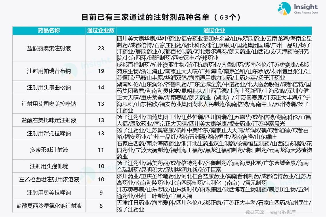 63 个通过企业已达 3 家的注射剂