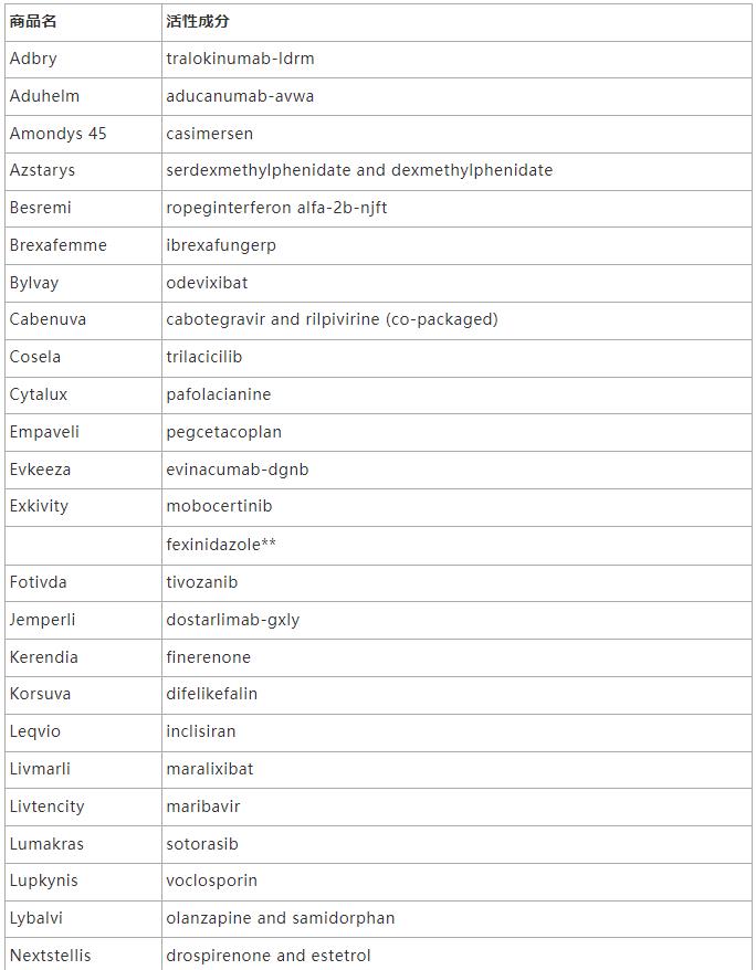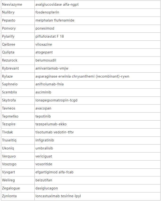 Adbry, Aduhelm, Amondys 45, Azstarys, Besremi, Brexafemme, Bylvay, Cabenuva, Cosela, Cytalux, Empaveli, Evkeeza, Exkivity, fexinidazole*, Fotivda, Kerendia, Korsuva, Leqvio, Livmarli, Livtencity, Lumakras, Lupkynis, Lybalvi, Nextstellis, Nexviazyme, Nulibry, Pepaxto, Pylarify, Qelbree, Qulipta, Rezurock, Rybrevant, Rylaze, Saphnelo, Scehnetko, Temb Tivdak, Truseltiq, Ukoniq, Verquvo, Voxzogo, Vyvgart, Welireg, Zegalogue, Zynlonta *获批时无商品名