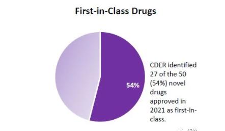 CDER将2021年批准的50个新药中的27个(54%)确定为首创新药。这些药物的作用机制与现有治疗药不同。