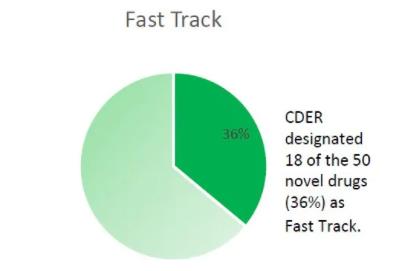 2021年批准的50个新药中有37个(74%)使用了快速通道认定、突破性治疗认定、优先审评和/或加速审批中的一项或多项加快计划。
