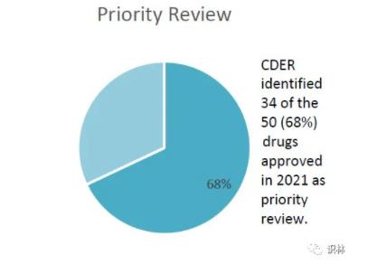 2021年批准的50个新药中有34个(68%)被认定为优先审评。如果CDER确定药品有可能在医疗方面提供重大进展,则该药品将获得优先审评。这意味着CDER的目标是在申报后6个月内对药品申请采取行动(标准审评为10个月)。