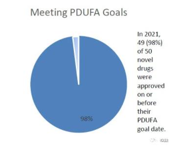 依据处方药使用者付费法案(PDUFA),行业被征收使用者费,为CDER提供资源以扩展审评活动的能力。PDUFA要求在特定时间范围内审评申请。在整个2021年,CDER对98%(49/50)的获批新药达到或超过了PDUFA目标日期。