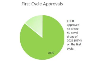 2021年CDER批准的50新药中,43个(86%)在“首轮”审评中获批。如此高的百分比反映了CDER工作人员就必要的研究设计要素以及药品申请中所需的其它支持全面药品审评的数据,向药品研发人员提供了清晰的信息。